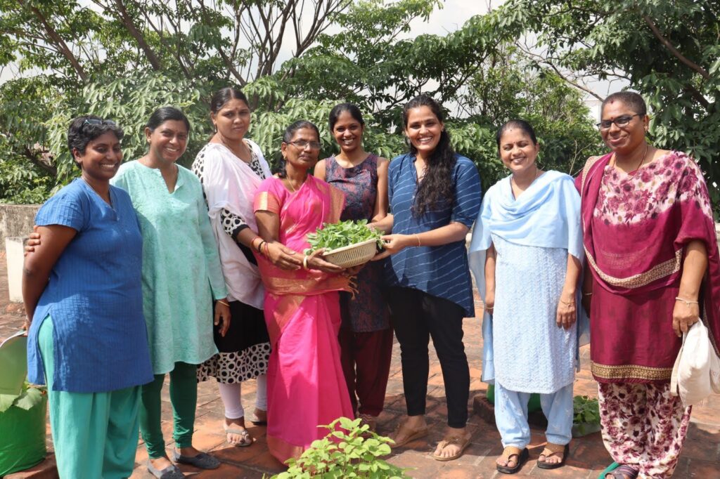 Volunteers from the Chennai Resilience Centre along with members of the Residents of Kasturba Nagar Association (ROKA) set up a terrace garden in the month of September at the Chennai High School, Kamaraj Avenue, Adyar. Through the garden the volunteers aim for a dual purpose of providing healthy food for the children while also helping grow their own food.